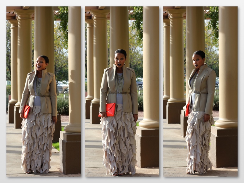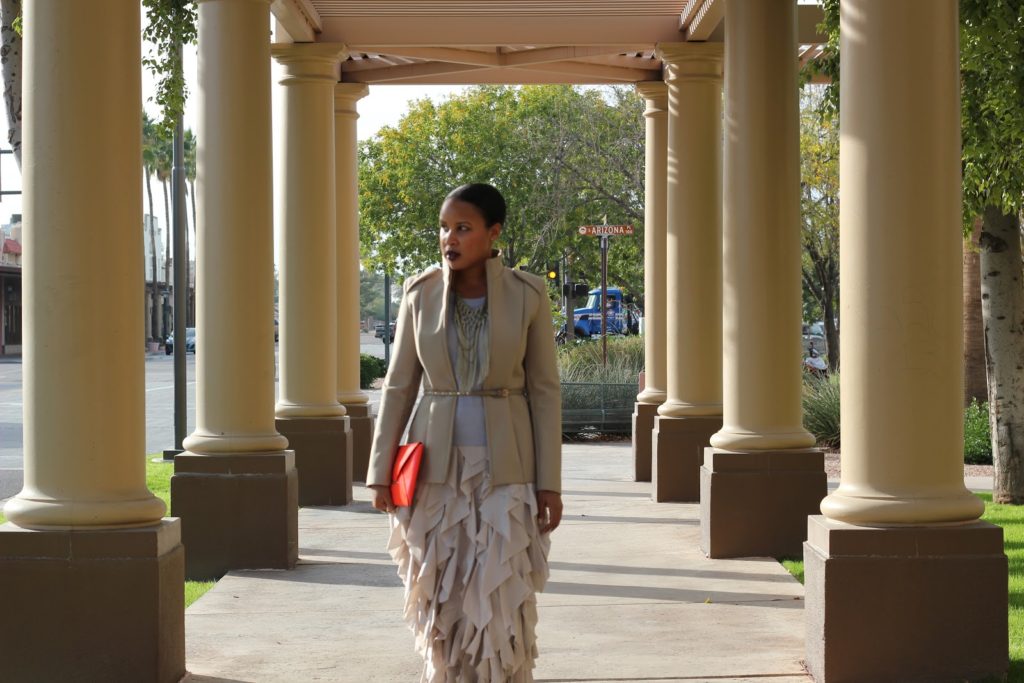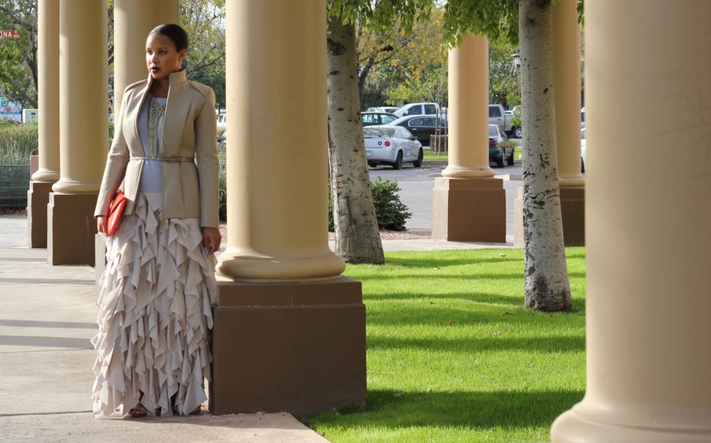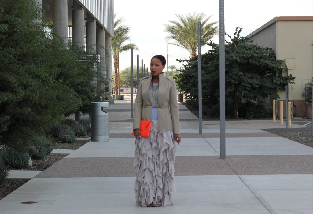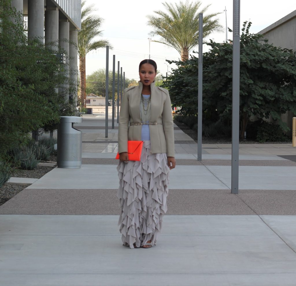 Moving on, this neutral collaboration is a great option for upcoming holiday parties. Wear head-to-toe neutrals with a pop of color, add a show stopping maxi skirt and you’re the bell of the ball. Please note, this outfit is sexy and stylish with little to no exposed skin. Yes, it can be done folks…