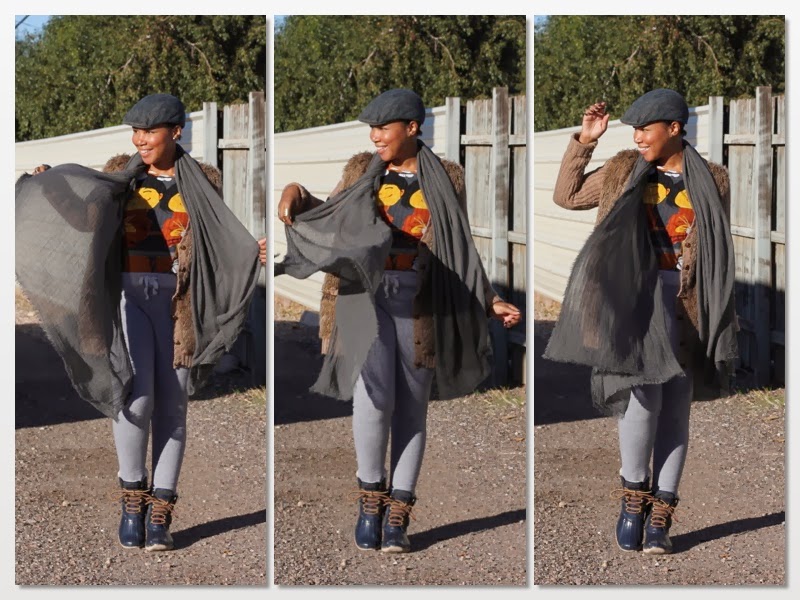 | Cardigan: Zara, Sweatpants: J. Crew, T-shirt: Custo Barcelona, Scarf: Zara |