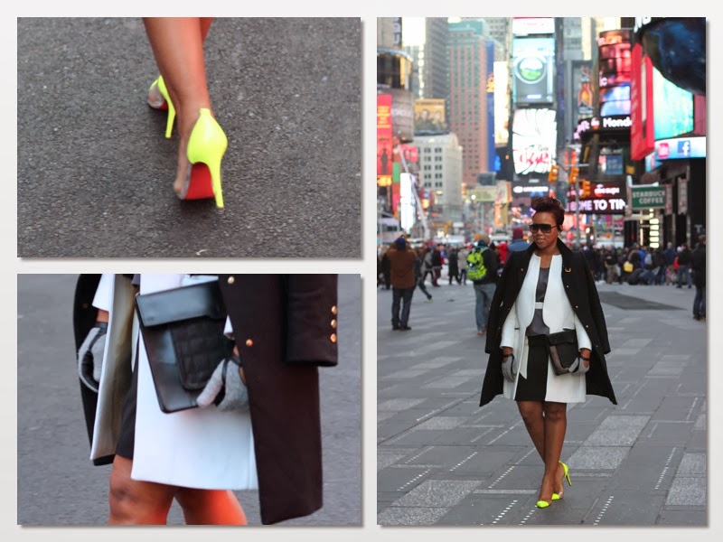 So, I definitely had to play tourist in between the shows. I went to Times Square to be amazed by the flashing lights! On this day, I doubled up my coats, focused on structural black and white and added a pop of color.Singing “Concrete jungle where dreams are made of…”