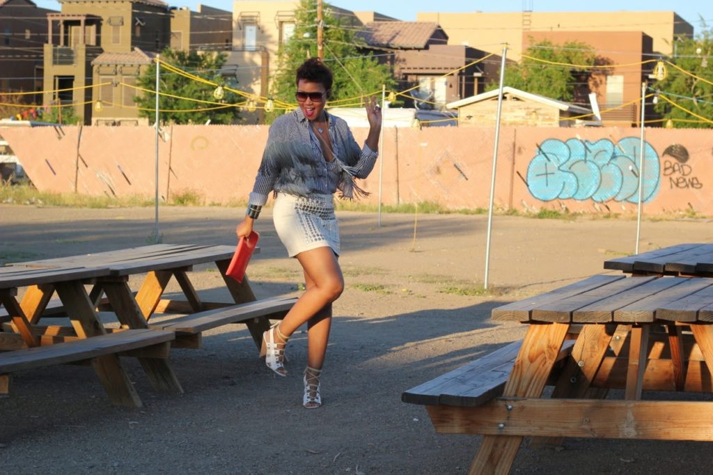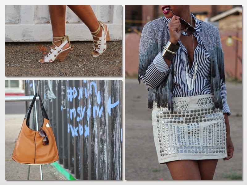 Fringed Kimono: Warehouse, Blouse: H&M, Skirt: H&M, Bag: Courtesy of Halston Heritage