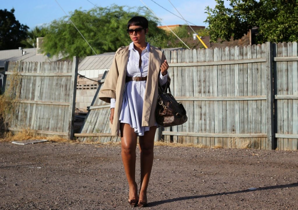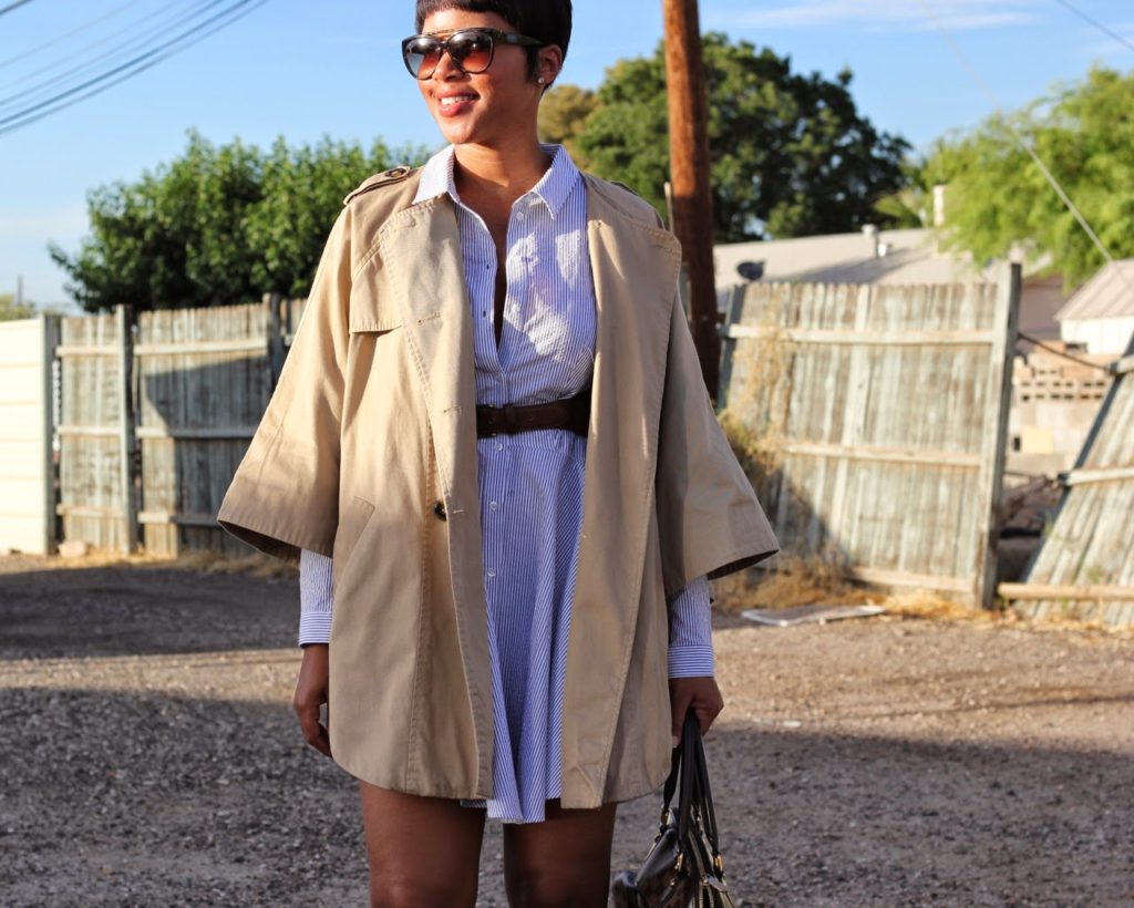 | Trench Cape: H&M, Shirt Dress: H&M, Harness: ASOS, Bag: Louis Vuitton, Shoes: Max Studio, Sunglasses: H&M |