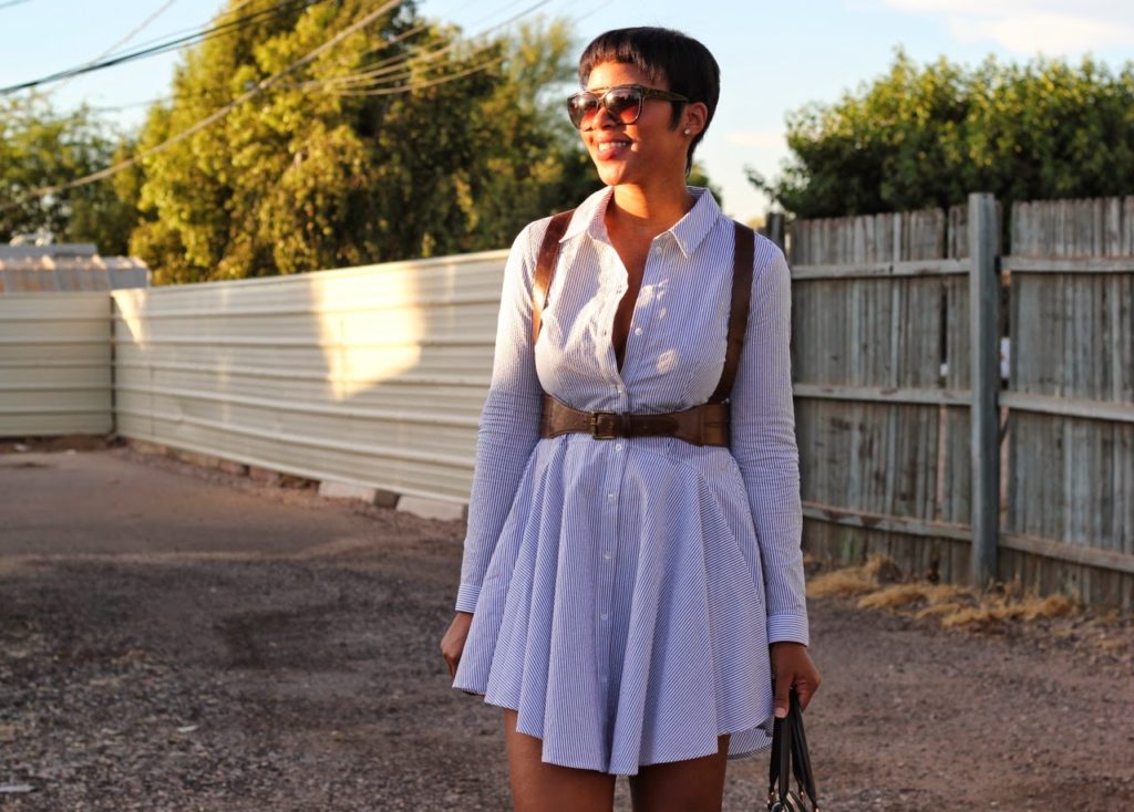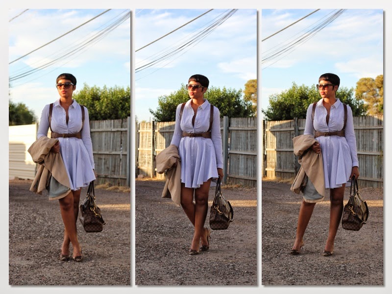 | Shirt Dress: H&M, Harness: ASOS, Bag: Louis Vuitton, Shoes: Max Studio |