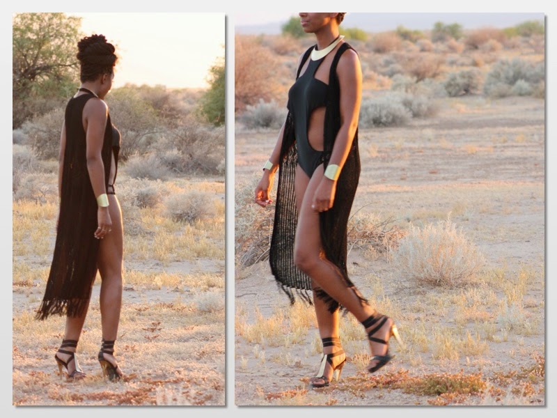 | Necklace: Topshop, Swimsuit: Nasty Gal, Collette’s Black Kimono, Cuffs: H&M, Sandals: Steve Madden |