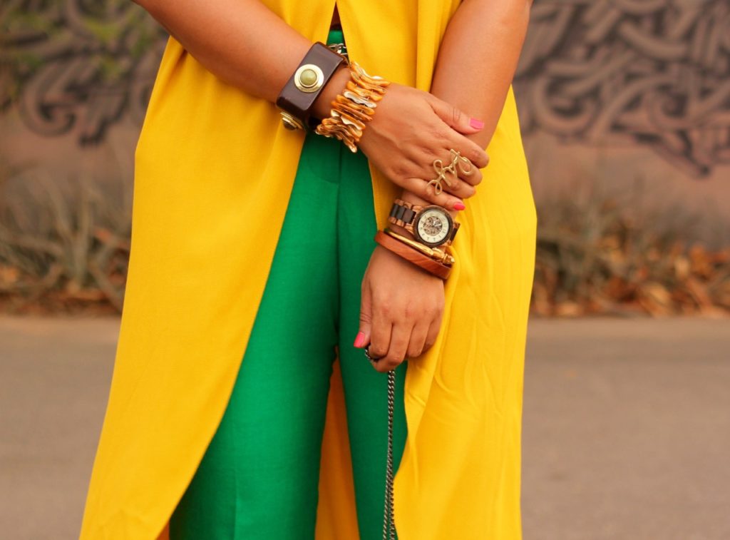 When I finally received it in the mail, I explored several different options and finally decided on pairing the top with these emerald green pants from J. Crew. I love how the solid colors played nicely together. For the accessories, I went for wood, gold and tortoise shell. Oh, please say hello to my new wood watch from JORD. Isn’t she pretty?