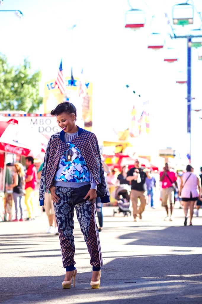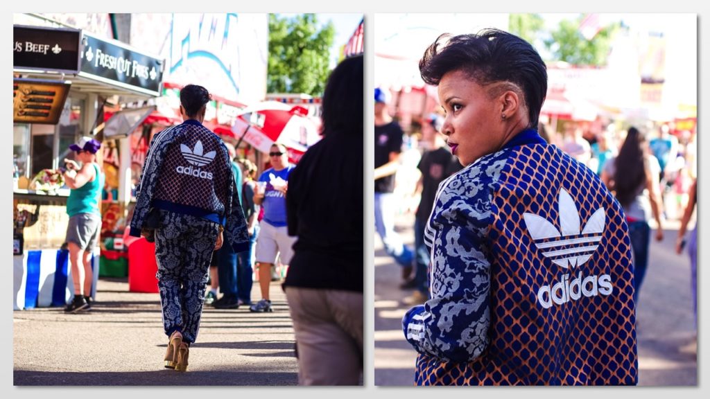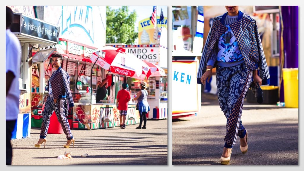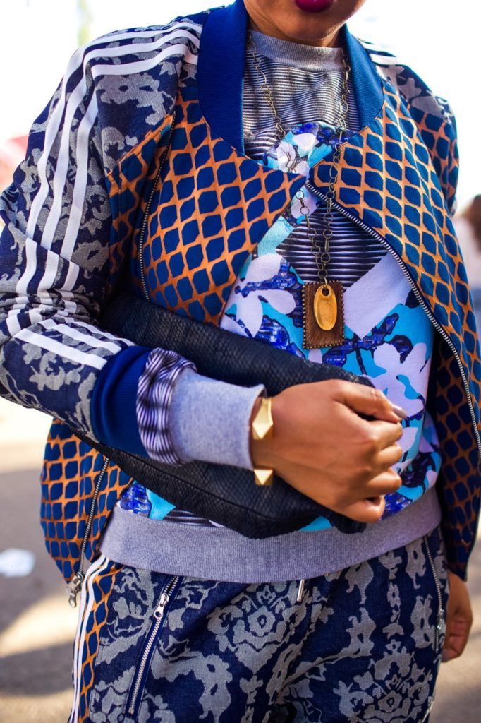 Now, usually, I don’t “do” this. I don’t think I’ve ever been the tomboy chic kind of girl. I like dresses and pencil skirts but bay-bee when I saw this track suit from Adidas, I knew that she was for me. Seriously, LOOK at all the patterns and prints going on in this look. It’s a paisley-snake print-three-striped wonderland.