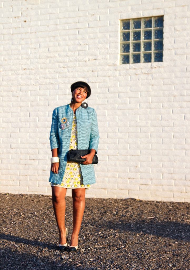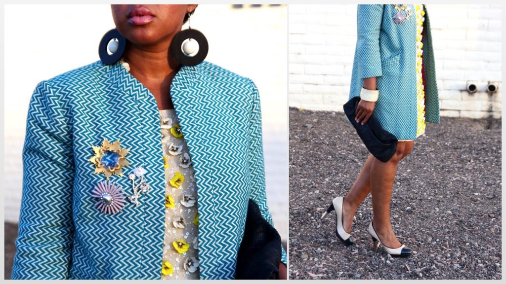 Well, last weekend, I had another wedding and was all lined up to purchase some new pieces until I remembered this embellished flower dress from ASOS. I’ve literally never worn it and knew it would be perfect for a Spring Wedding. I definitely went for a Sixties vibe by adding the blue three-quarter length chevron coat which I adorned with a little brooch party and the Chanel cap-toe pumps.