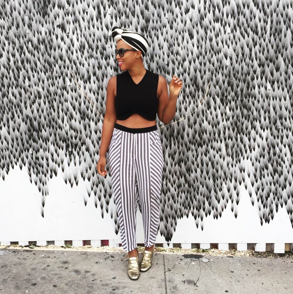 | The MCB Project Turban: Similar here | Prada Sunglasses: Ditto (Use code: THEWERKPLACE for one month free) | Zara Top: Similar here and here | H&M Pants: Similar here and here | Jimmy Choo Oxford Shoes: Similar here Location: The Bushwick Collective |