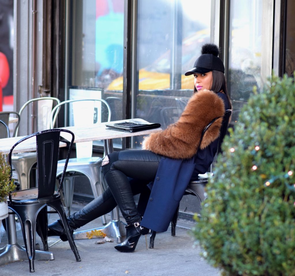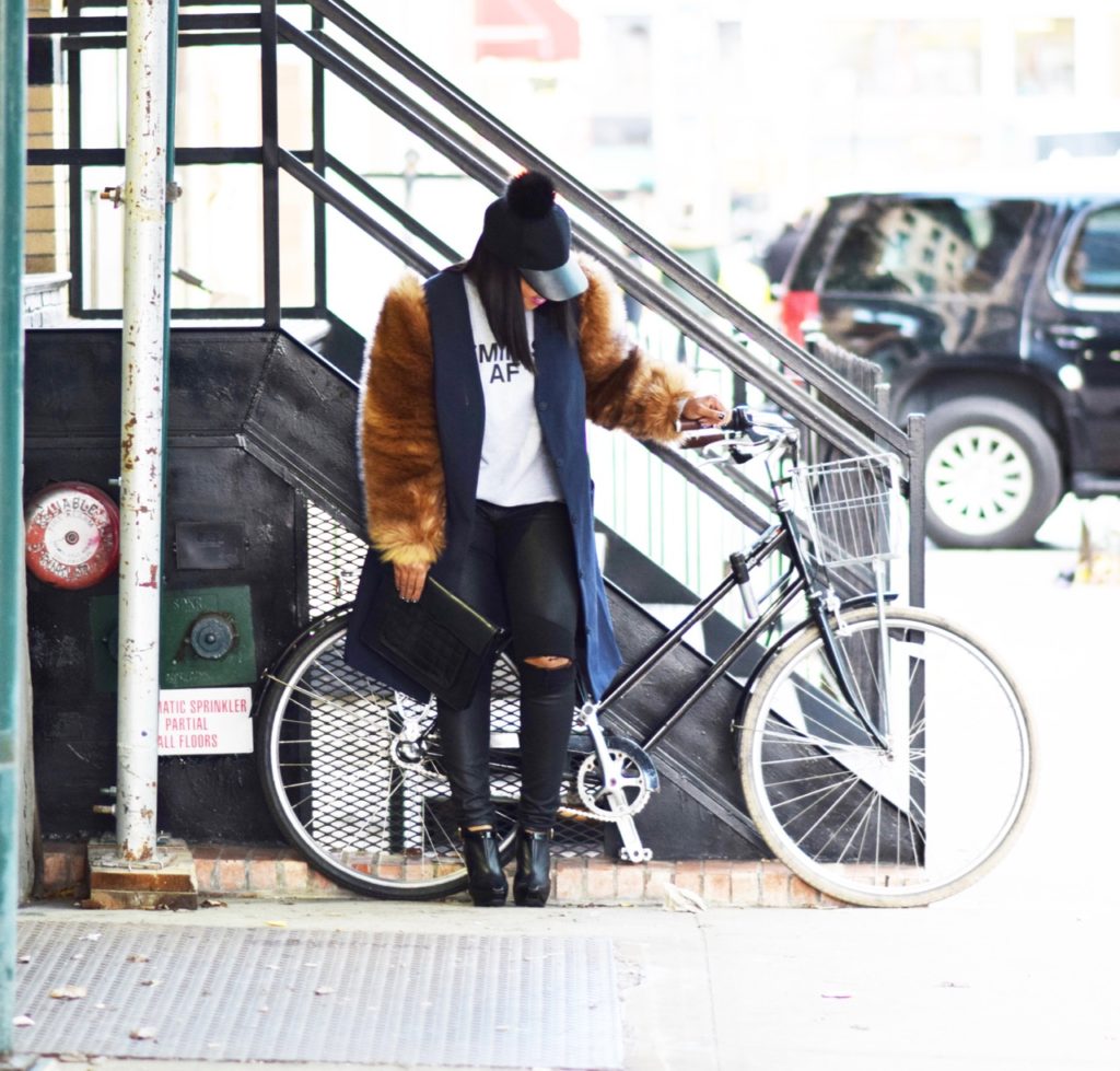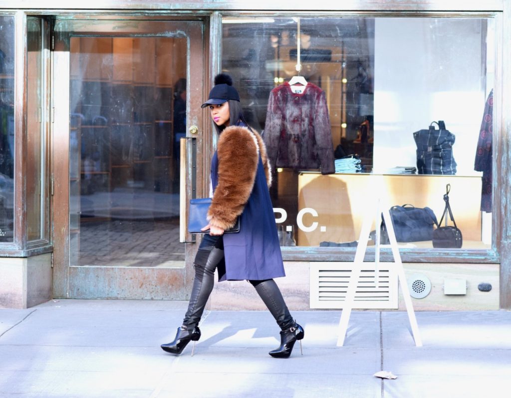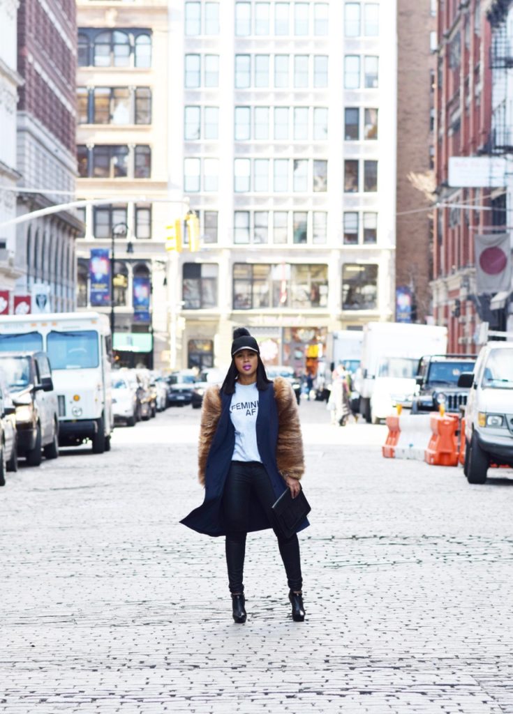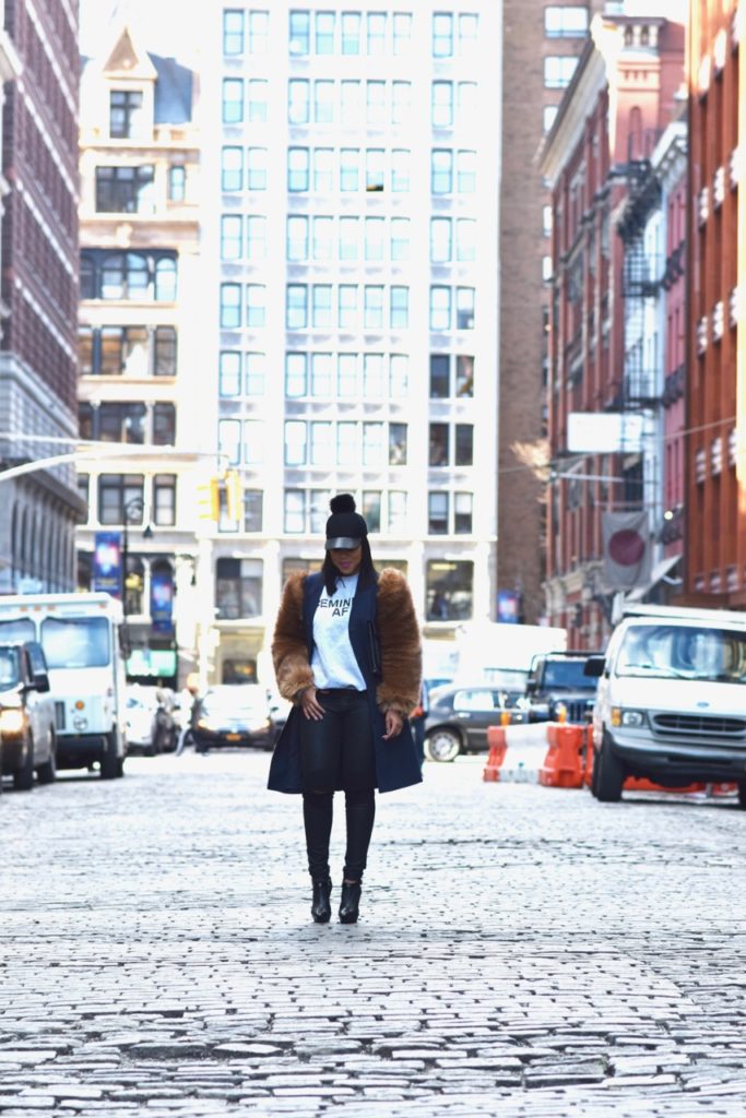 Statement coats like the one featured in this look can take a look from zero to hero! I’m literally wearing jeans (very dope jeans, by the way) and a sweatshirt. Talk about outfit elevation! This is how it’s done, folks.