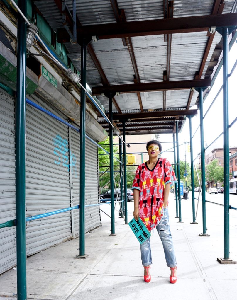 In today’s look, I’m featuring a dress from MaXhosa by Laduma. I added the yellow trimmed raincoat from ASOS, ripped Cult Denim boyfriend jeans, the red stunners from Giuseppe Zanetti and a fun clutch from Zara. See, even when I’m trying not to, I still can’t help adding a piece or two from some of my favorite fast fashion retailers.