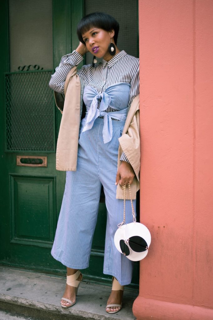 For this look, I added my trusty striped H&M button down shirt to get a little stripe on stripe action going. I, also, added in some fun black and white accessories and tied the look together with a neutral sandal from Iro.