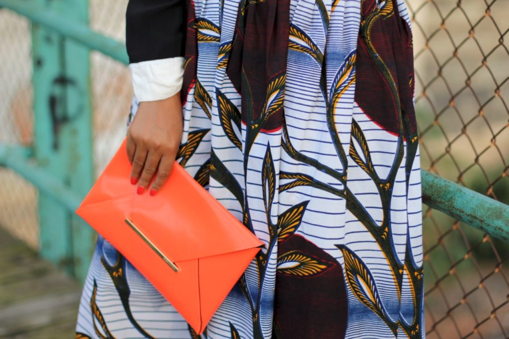 The colors in the top, also, complement the colors in the skirt which is why this works so well together. It helps to tie the look together with accessories. For instance, the orange clutch that I wore in this look helps to connect the top to the skirt.