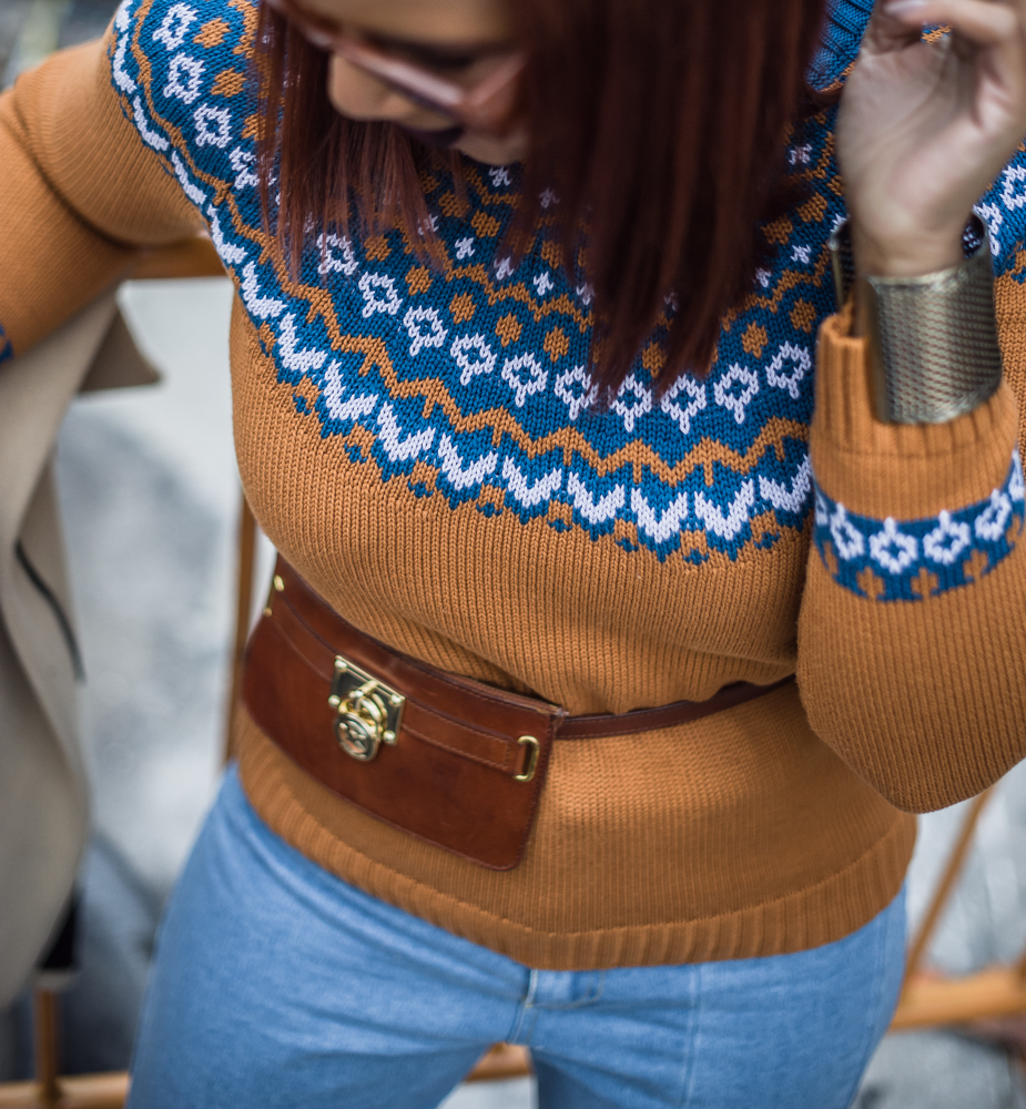 Because this sweater gave me a seventies vibe, I had to pair it with these flares from Daya by Zendaya and this oldie but goodie Michael Kors belt bag. I draped my oversized tan coat from Zara, slipped on a matching pair of pumps from Stella McCartney and I was good to go!