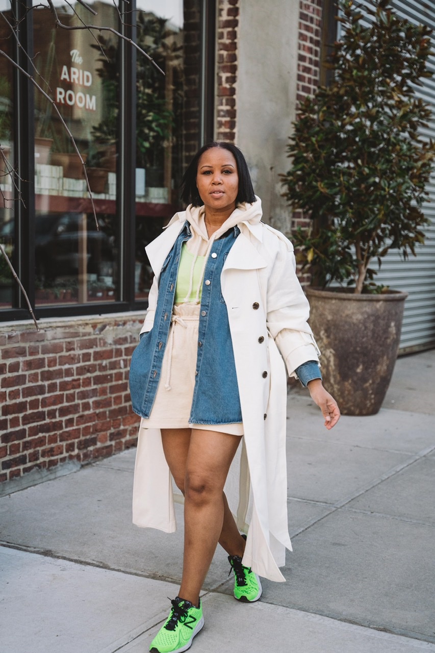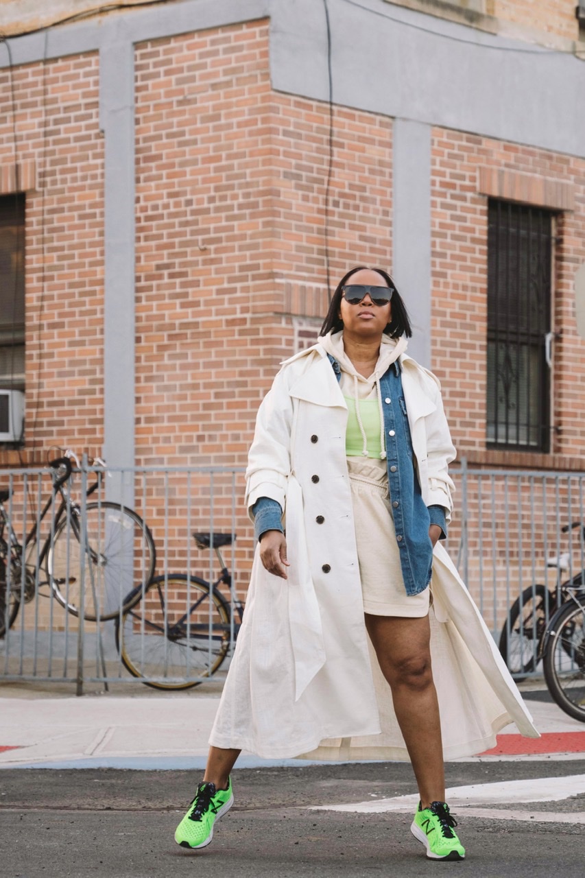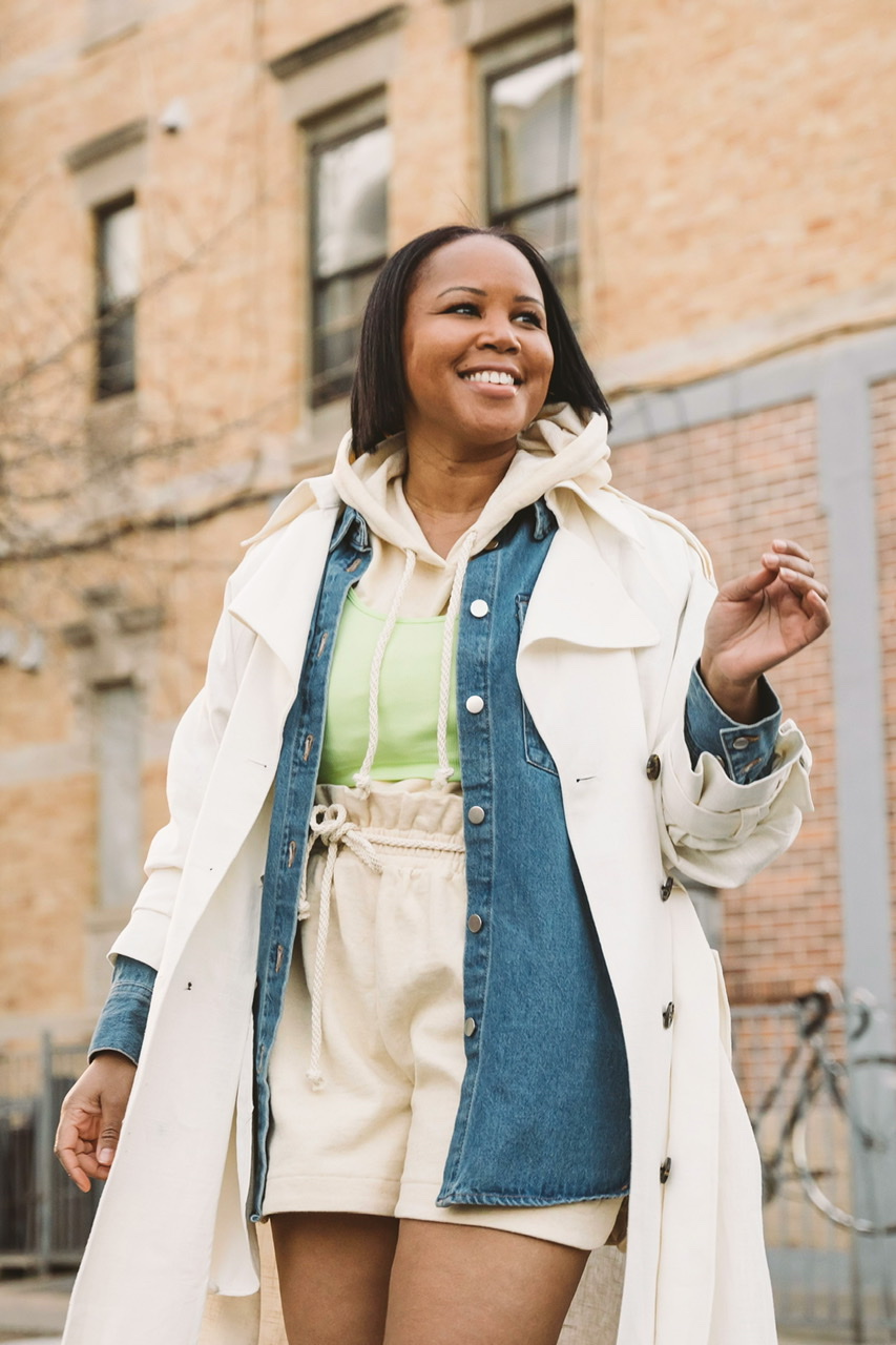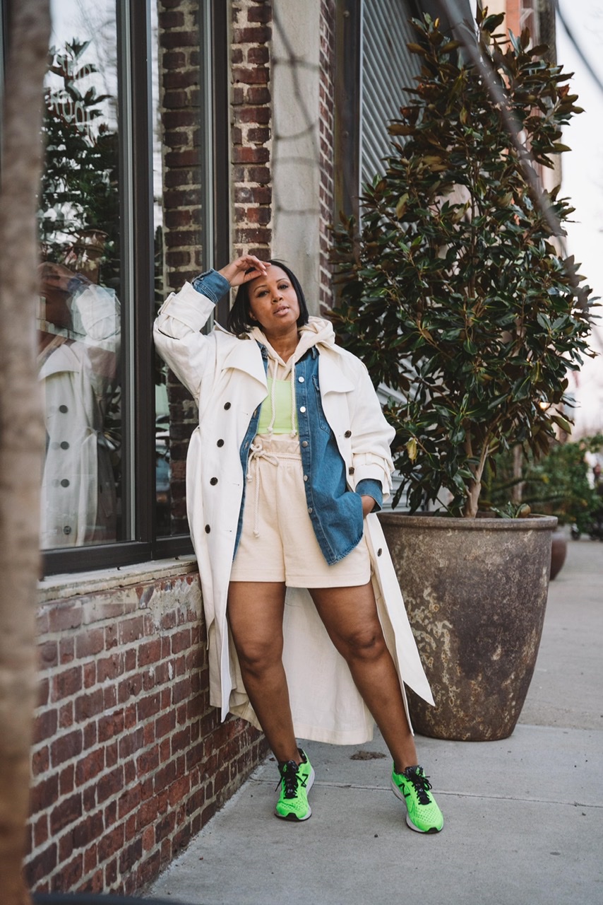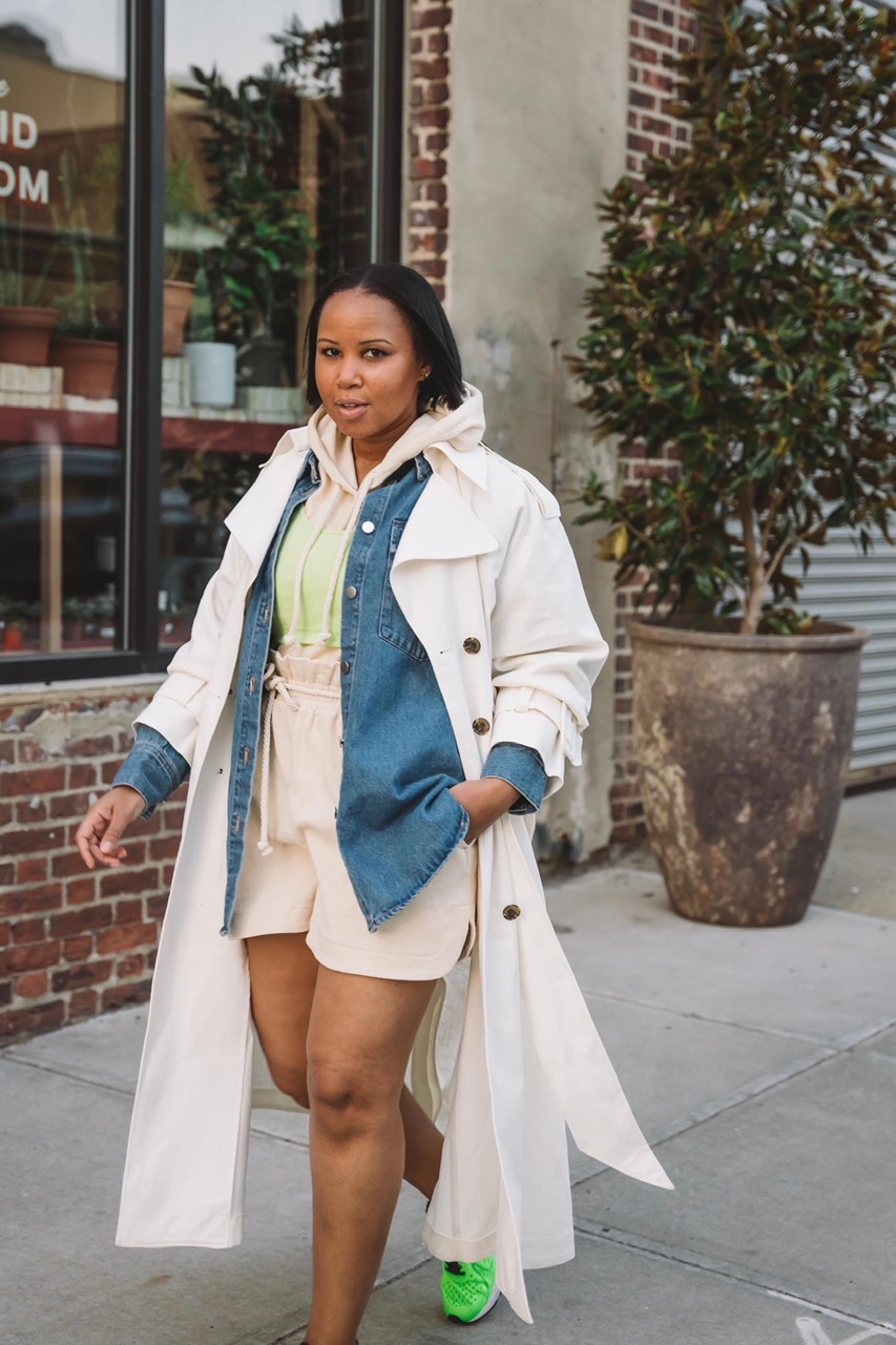Experiment with the lengths. In this look, the denim shirt is a bit shorter than the shorts, yet, the trench coat is longer than everything else. That helps with the flow of the look and everything isn’t stacked on top of each other which isn’t bad but it helps with bulk reduction.